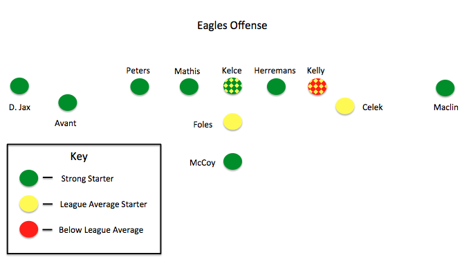 Everyone likes graphics, so I put one together showing the holes in the current Eagles roster (only starters.) I realize not every player will return, but as of this moment, this is what it looks like. First, the offense: