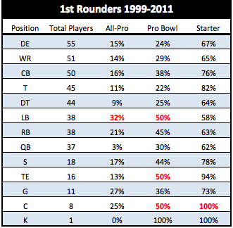 – LBs have proven to be the most difficult to peg. The position has the lowest rate for starters out of the first round (58%), but the highest rates for All-Pros and Pro Bowls. That tells me LBs are perhaps the hardest players to evaluate coming into the league.