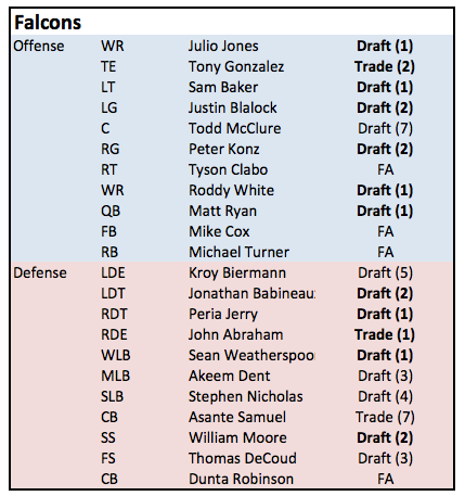 – We can immediately see the importance of hitting on your 1st round draft picks. The Falcons have 7 starters who were acquired with 1st round picks. The Ravens have 5. The Eagles have just 3 4 (Peters should be listed as “Trade (1)”. Needless to say, this year’s top pick is hugely important .