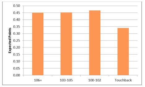 Now, the model I used for my Expected Points estimates the value of a first and ten at your own 20-yard line (the situation in a touchback), to be worth approximately 0.34 points. That may not seem like very much, but remember, 80 yards on a football field is a long way to go.