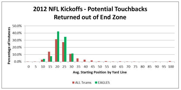 When the Eagles returned kicks this year, and specifically brought the ball out of the end zone, they created an average of 0.16 expected points, significantly worse than simply taking a touchback. Now, a good portion of this score is skewed by one specific play, namely, Brandon Boykin fumbling a kick return against Carolina in week 12. But even when you remove that turnover, the results are still worse than if they had simply taken a knee every time.