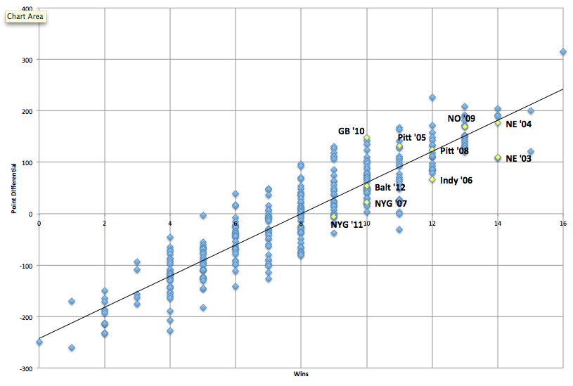Here is a fun chart. No great insight, but still interesting to look at. I graphed every team’s point differential vs. its regular season wins for the last ten seasons and highlighted the Super Bowl winning teams.