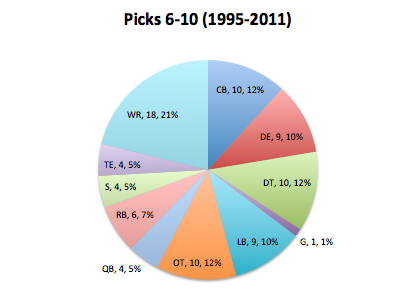 First, let’s look at Defensive Ends. In the above charts we can see that from 1995-2011, 11 DEs were taken in the top 5, 9 were selected from 6-10, and 14 went between picks 11 and 15. Were the top 5 picks any more likely to become elite players?