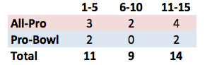 Well it depends on the position, obviously. The overall thesis from the last post was that teams are no more likely to find All-Pro caliber players in the top five than they are to find them with picks 11-15. Overall, the data bears that out. However, if you are looking for an All-Pro quarterback, its pretty clear that you need to take them in the top 5, if only because top graded QBs don’t last very long (so most “1st Round” QBs go in the top 5).