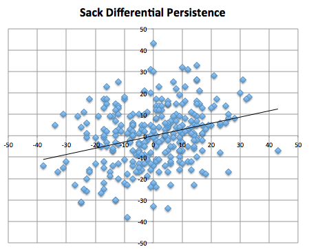 I looked at both sacks and sacks allowed, to see if there was a noticeable difference in persistence.  First the charts, then the numbers, then interpretation.