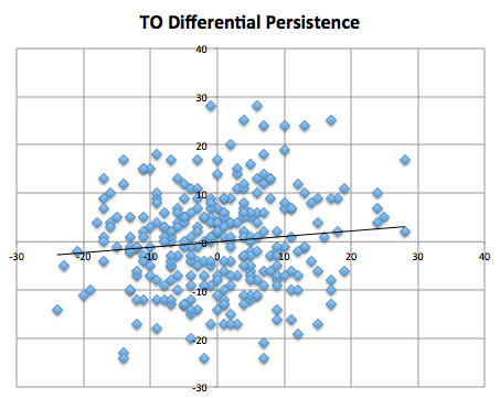 I’ve included the trend line because without it it’s tough to see the relationship.  The correlation value is .29.  Not huge, but significant.  However, by itself it doesn’t tell us too much.  We’ll look at turnover differential persistence now, then we can compare the two.