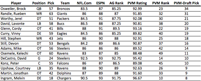 – Vinny Curry makes an appearance high on the list, falling 19 spots from his PVM Ranking.  Let’s hope Chip Kelly finds a way to realize the potential most scouts think he has.