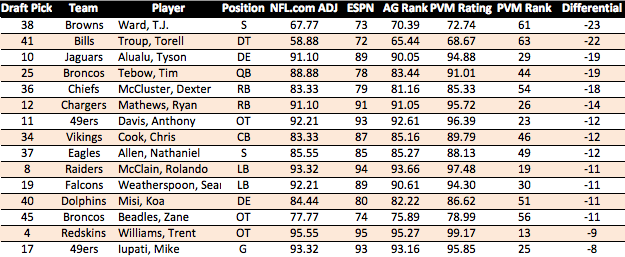 In the meantime, here are the top 32 prospects for 2010 via the PVM system.  For these, I used ESPN and NFL.com ratings, though the NFL.com ratings had to be adjusted to a 100 points scale.  Remember, the right-most column is the player’s actual draft pick minus his PVM Rank.  So players with a negative number were drafted HIGHER than their PVM Ranking.  Only players chosen in the top 2 rounds are included in the analysis.Screen Shot 2013-03-11 at 2.51.20 PM