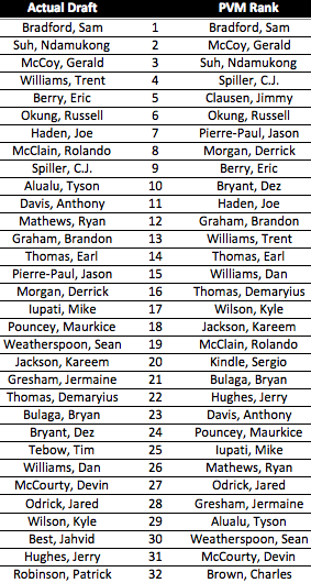 Also, I realized I didn’t do a good job of showing the big picture. No individual player’s ranking will be perfect in any system. The goal is to create a system that, overall, does a better job of valuing players. Here is a table showing the actual first round of 2010 with the PVM top 32. We’ll delve deeper into this type of comparison some other time, for now you can analyze/compare them and make up your own mind.