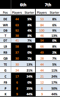 Let’s bring back our draft chart, this time only looking at the 6th and 7th rounds.  To refresh, the chart was put together using every player drafted from 1999-2011.  Players were classified as “starters” if they either started for 5 years or, if they have not been in the league that long, started for at least half the seasons in which they’ve been in the NFL.