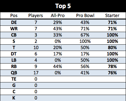 Before we start analyzing, I want to warn everyone about the danger of small sample sizes. The reason I haven’t typically broken the draft into such small sections (1-5) is that when you do that and combine it with a positional breakdown, the samples get way too small to draw any conclusions from. For example, there have been just 2 safeties drafted in the top 5, Sean Taylor and Eric Berry. Both were/are very good players and each made the Pro Bowl. However, it’d be wrong to suggest that the odds of a top 5 safety making the pro bowl are 100%. In light of that, try view this data in a proper context.