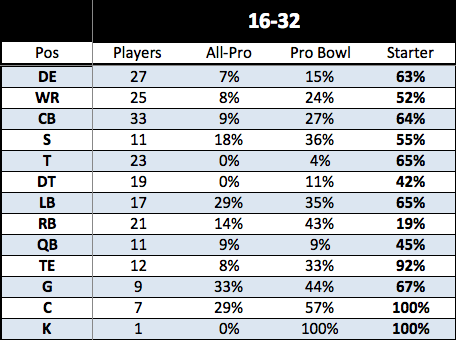 – QBs, as we’ve discussed, are very risky throughout the first round, but especially so in the second half of it. Just 45% of QBs drafted between 16-32 became “starters”. Just one of the 11 became a Pro Bowler (Aaron Rodgers).
