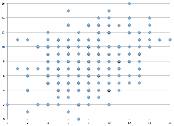 There definitely appears to be correlation (as we’d expect), but the value is just .30 (weak/moderate). Additionally, I’d argue that within this sample are two teams that have an inordinately large impact on the overall correlation values by virtue of their remarkable consistency (the Patriots and Colts obviously). While I’m usually hesitant to play with the sample, in this case I think it’s worth looking at the results without these teams. In essence, due mainly to the Brady/Manning effect, I think they are anomalous and a poor representation of the usual state of the league. More specifically, I think they are useless when it comes to drawing conclusions about the Eagles this year.
