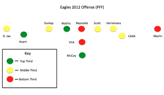 – I know everyone loves Jason Kelce, but PFF graded him close to the bottom for his rookie year. I think he’ll be good, but this is another position at which fans seem to be buying the upside without realizing there’s a reasonably significant chance it doesn’t work out. For the record, his rating in 2011 would have placed Kelce LAST in 2012, below Dallas Reynolds.
