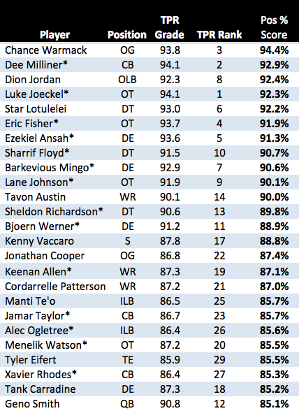Again, since we don’t have NFP’s ratings, this isn’t an exact apples-to-apples comparison. Regardless, we can see at the top of the board that Andrew Luck was a far better prospect than anyone available this year (not that we didn’t know that).