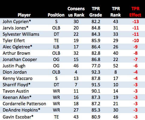 First the fallers. These are players whose consensus scouting ranking is HIGHER than their ranking in the TPR system. As a result, these are players we expect to be OVERDRAFTED. Now we need to be careful about the relative magnitude here. For example, a ranking difference (as shown in the TPR Effect column) of just a few spots isn’t a big deal. We’re mostly concerned with the larger movements, as they indicate a wide divergence between perceived value and actual value (as we’re attempting to quantify it here).