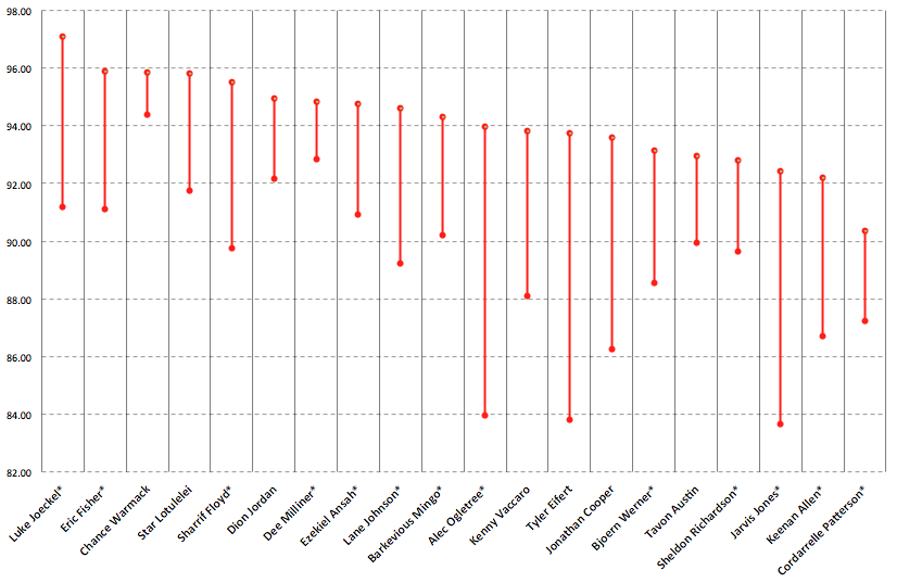 Notice the scale on the left. All of these prospects are graded very similarly. Taking “risk” into account, it appears as though the “top tier” is 9 guys deep, ending with Mingo and before Ogletree. With this in mind, the Cardinals at #7 and the Jets at #9 are the best potential trade down partners for the Eagles. The team can pick up an extra pick (potentially a high 2nd rounder) and still select a “top tier” prospect, though Mingo is actually the only guy in that group I really DON’T want.