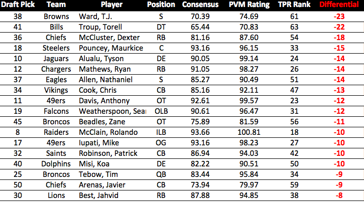 – The other players I’d point to are Jamar Taylor and Menelik Watson. Each of them fell a significant amount (more than 20 picks), so it’s possible there are some behind-the-scenes issues with both players. However, given the significant rankings deviation we saw throughout the draft, it’s also possible these guys were just overlooked.