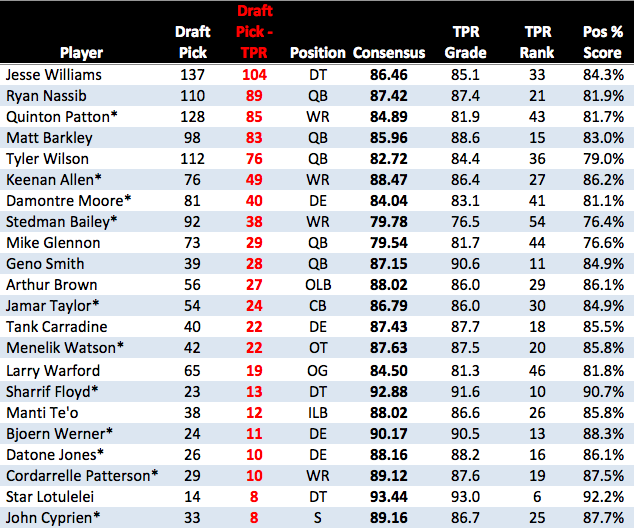– The rest, however, I’ll take credit for, particularly those at the bottom. Notice that Star Lotulelei, John Cyprien, Bjeorn Werner, and Cordarrelle Patterson all carry relatively high “positional scores”. That means, ignoring of positional impact, they are good prospects. Star, though he only “fell” 8 spots, jumps out due to his 92%+ score, but the others are clear “value” picks as well.