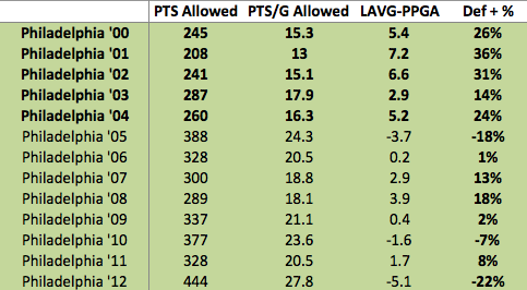 As I illustrated earlier this week, the Eagles’ defense under Andy Reid was MUCH stronger from 2000-2004 than it was thereafter. As a reminder, here is the team’s Points Allowed performance from 2000-2012. The “LAVG-PPGA” shows how many FEWER points per game than the league average the Eagles allowed that year. So for the 2000 season, the Eagles allowed 5.4 points per game less than the league average. The “Def+%” shows that margin divided by the league average, which gives us the percentage difference (which accounts for the offensive inflation over the years).