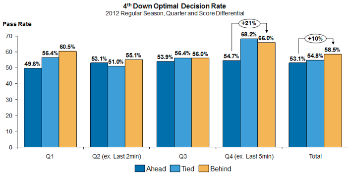 When coaches are behind, they make more optimal decisions roughly 10% more than when they’re ahead.  And in the fourth quarter, that gap is even bigger.