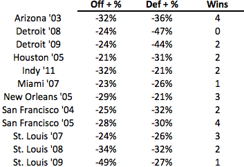 To find such teams, I looked at the last decade in the NFL (2003-2012) and found every team that was more than 20% below league average in BOTH Points Scored and Points Against.