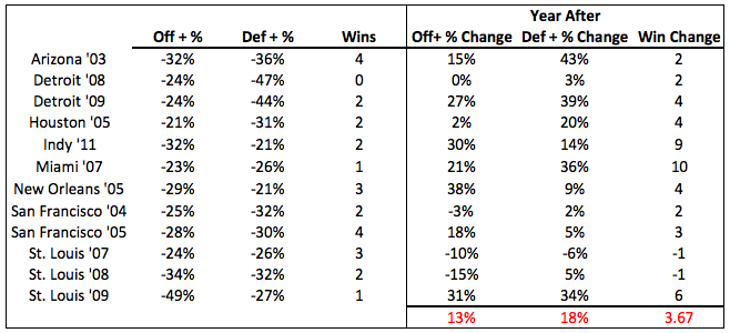 Now that I’ve cleared that up, let’s look at the results, which I’ve highlighted in Red. On average, the teams improved their offensive production by 13% (relative to league average) and their defensive performance by 18%. Those are obviously HUGE gains. Perhaps most importantly, the teams above, on average, improved by nearly 4 wins.