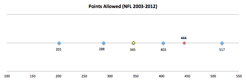 So the 2012 Eagles scored 280 Points, which is significantly worse than the time period average (345), but within 1 standard deviation (272).