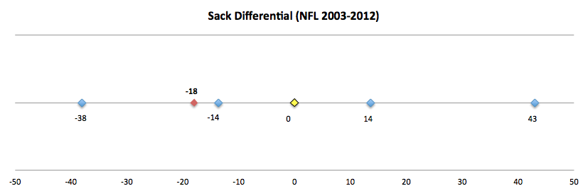 Obviously I’m late to the party on this post, but one unhelpful thought I had on the dashboard is to realign the metrics in which a positive number is actually a negative (i.e., “fumbles lost” and “points allowed”) so that “bad” values always appear on the left side. That way – much like the equalizer on a dated stereo receiver – we could quickly scan across the fields to see where we’re REALLY bad historically, or surprisingly good, etc.