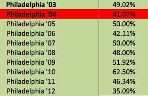 Before we look at the whole league, here are the Eagles’ yearly total fumble recovery percentages from 2003-2012: