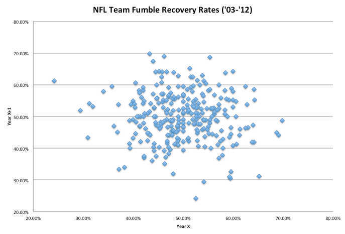 Due to the factors I cited above (roster changes, personnel differences, etc…), we can’t say definitively that fumble recovery % is all luck. However, we can absolutely say that a team’s % for one year doesn’t tell us anything about it’s expected % next year. In other words, the Eagles 35% recovery rate in 2012 doesn’t tell us anything about the 2013 season.
