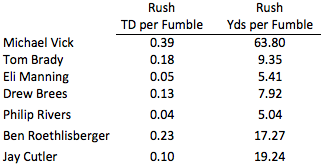 In context, things look a lot better for Vick.  Yes, he’s fumbled more than anyone else.  However, he has also provided a LOT of additional production on the ground.  Looking at the stats a little differently, we can see the differences more clearly:
