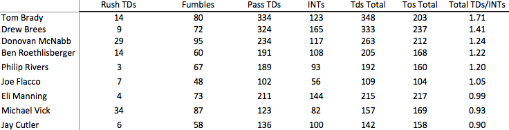 Again, simplistic but informative.  Here is a table showing a selection of QBs with their Rushing TDs, Passing TDs, INTs, and Fumbles.  I’ve also totaled the TDs and TOs and provided an overall TD/TO ratio.