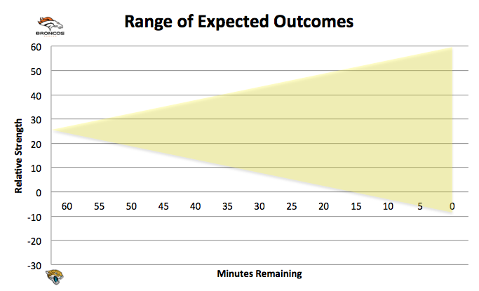 Now let’s look at the “Random Walk / Ex-Ante Relative Strength” model (the name needs work).  Here’s the picture again, just imagine a Patriots logo instead of the Broncos and a Giants logo instead of the Jaguars.