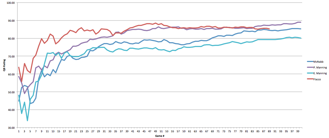 I only included the first 100 appearances (NOT starts) for each player.  Note that this is an ongoing calculation, so it becomes less susceptible to change with every appearance.  I’m hesitant to draw any conclusions from such a small sample size, but including other QBs (I originally included Vick, Brady, Brees, and Josh Freeman) makes the graph too hard to read.