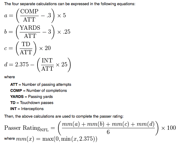 Before we get there, though, a PSA: The NFL QB Rating calculation, while useful, is very convoluted.  Almost nobody knows it or has even seen it, so for your education, here it is (from Wikipedia):