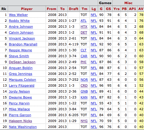 Following is a list of the top WRs over the last 6 seasons, as measured by Approximate Value. AV is certainly not a perfect measure, and I don’t mean to suggest it is. However, it’s a very good one, especially for offensive skill players. Anyway, here’s the list: