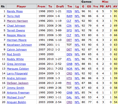 Let’s stick with AV for a moment, but take a slightly different look. I’m always bothered by the “since he’s been in the league” ranking, because it’s a very arbitrary measure, typically skewed in favor of the subject player. So, let’s change our filter. Instead of looking at all WRs from 2008-2013, let’s just look at the first 6 years of each individual player’s career, going back to 1990. Here’s the top 20: