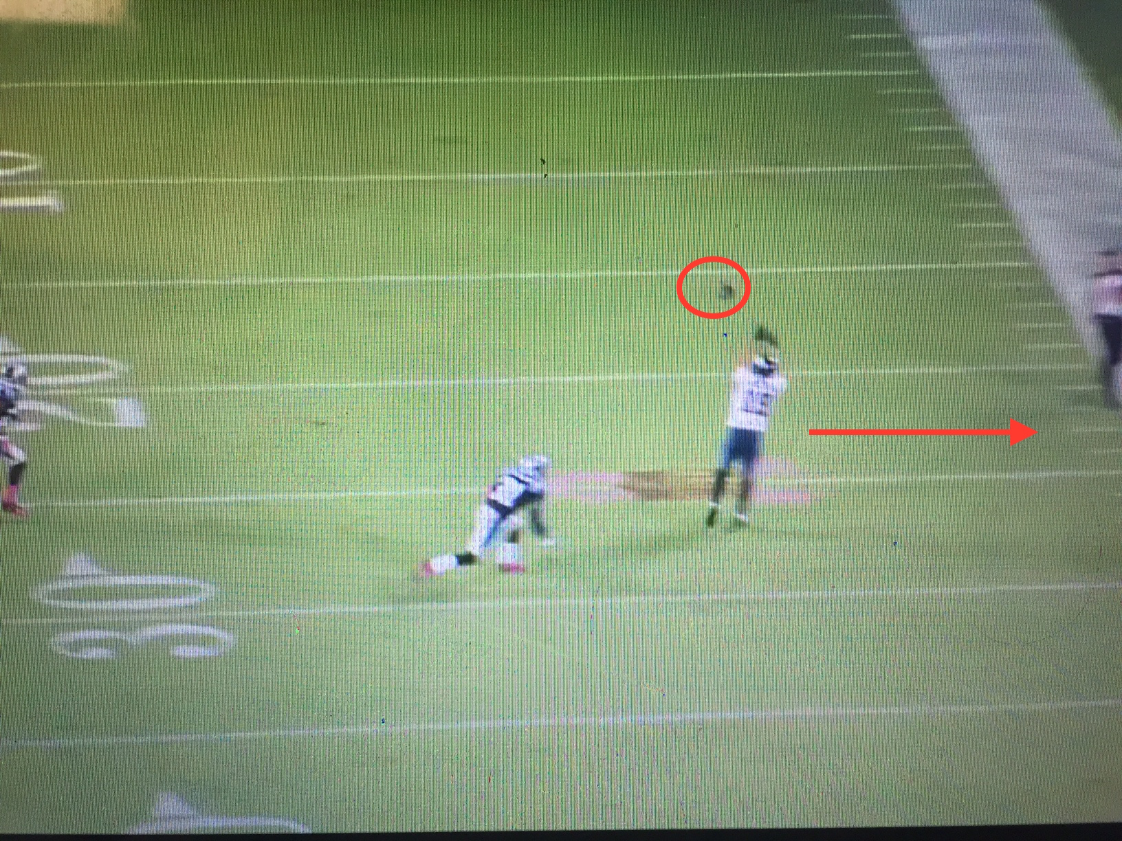 This is the precise location that you indicated was the optimal placement of the ball. In your still of the catch point, however, you place a red circle to the right of Huff’s head, while the ball is clearly to the left of his helmet and has not yet made it to Huff. The circle is over the guys crotch standing behind the endzone and nowhere near the ball. This makes it appear to be a much harder catch than it was. In fact, if you watch the footage or even just go off of your still, while Huff has to stop and jump a bit, the ball still hits him in the hands and is IN FRONT of his body in relation to the direction he’s moving. This is not the super difficult and underrated back shoulder pass that you’re alluding to. This should be a routine catch for a professional WR.