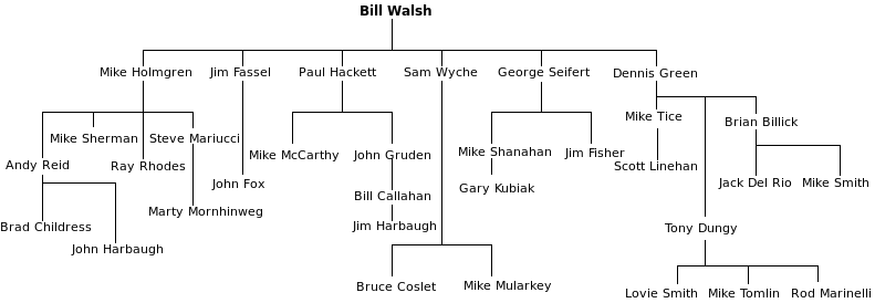 The offense was created by legendary 49ers head coach Bill Walsh, whose success is matched only by his simply incredible coaching tree that he has amassed, with Walsh, Dungy, Billick, Holmgren, Harbaugh, Gruden, McCarthy, and Shanahan all winning Super Bowls:
