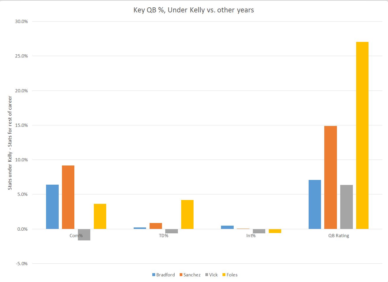 The baseline 0.0% is the career averages of each quarterback. So, we see that Bradford saw a 6.4% increase in his completion percentage playing under Kelly, Nick Foles saw a 27% increase in his quarterback rating, and so on and so forth.