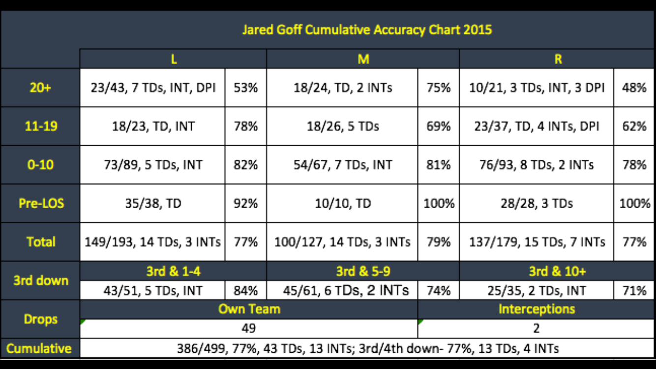 As we saw above, Goff excels with deep passing, especially on loft passes outside the numbers and up the seam.