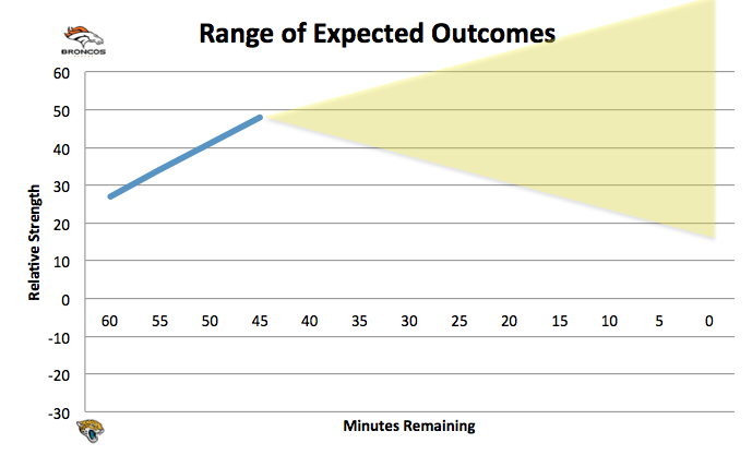 In the above illustration, using our equation, Jacksonville has already lost. Basically, it will be nearly impossible for the Jaguars to outperform the Broncos by more than 21 points over the remaining 3 quarters, by virtue of what we know about their Relative Strength.
