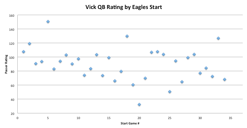 Through 3 games, his sack rate is 10.8% (11 sacks). For his career, it’s just 8.7%, so clearly things are not going according to plan. Again, we have to talk about the opposition. KC will probably finish the year among the league leaders in sacks, and 6 of Vick’s sacks (more than half) came against the Chiefs. That’s not normal and won’t continue.