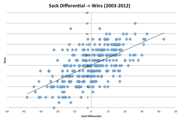 For illustrative purposes, here are two charts showing the correlation between TO Differential and Wins and Sack Differential and Wins. For both, the data set is all NFL teams from 2003-2012, so 320 data points.