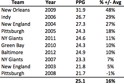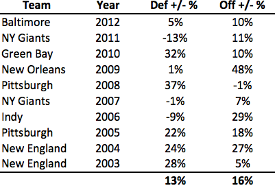 If you missed part one (posted yesterday), I encourage you to read it before moving to today’s continuation. At the end of yesterday’s post, we arrived at a default 4th Down Strategy chart, essentially a cheat sheet that tells coaches when to go for it and when to punt/kick a FG. For future reference, I have added the chart as a permanent fixture that can be accessed through one of the menu tabs at the top of the site. That should make watching the games more fun (or frustrating since you’ll know in real-time when bad decisions are being made).