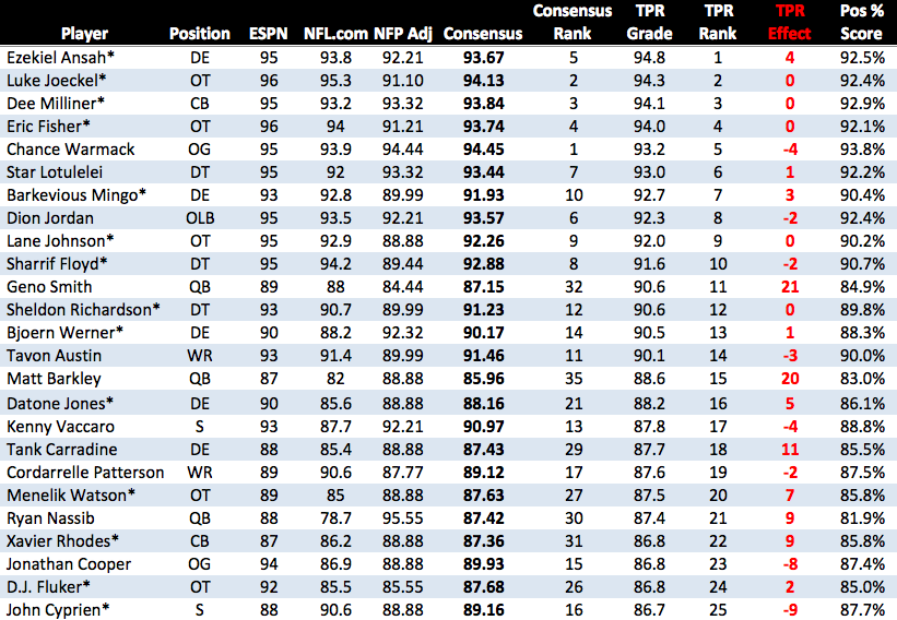 To make things clear before I get to explanations, Barkley’s average rating (from NFP, ESPN, and NFL.com) was 85.96. That’s not great, but it does usually represent a 1st round grade. Nassib’s was actually higher at 87.42, due mostly to the fact that NFP had Nassib as its #1 overall player.
