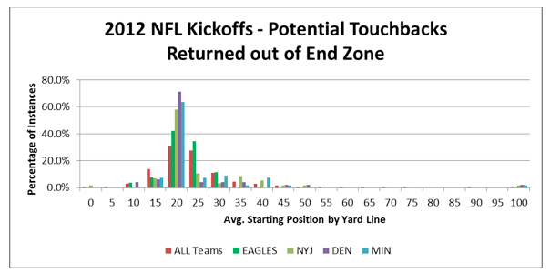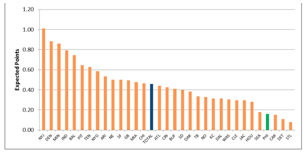 Lastly, the first round of the draft is fundamentally different from the other rounds, especially in the very early picks. The goal in the first round (especially in the top 10) is to find an elite player, regardless of position. Therefore, as a general instruction for using the strategy we develop here: It should be adhered to more strictly as it gets later in the draft. So picks in the first round should be based largely on scouting and player evaluations, whereas picks in the 7th round should be based almost entirely on historical probability. This is particularly important for Eagles fans, since the team has the #4 overall pick. For that selection, throw this chart away and hope for an All-Pro caliber player at whatever position in which that skill level is available.