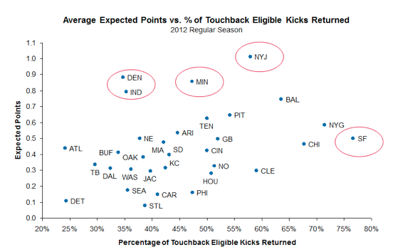 – The 5th and 6th round are particularly notable for the small number of positions for which these picks make sense. The 6th round is a relative wasteland, suggesting that at this point scouting means nothing. Therefore, if we stick to the chart, a team should either choose a DT, TE, or G in the 6th round or trade down into the 7th round. Any other decision is an inefficient use of assets.
