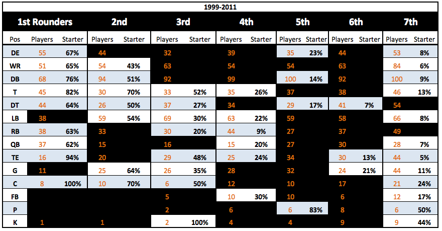 I’ve blacked out areas that, in my opinion, are not good values based on our stats. Consult yesterday’s post if you want to check the odds yourself, but in most cases I just eliminated rounds that offered no better odds of success than later opportunities. Careful observers will note that I could have gone much farther if I applied the relative draft pick value standard to each area. For example, according to the default NFL Draft Value chart, a 5th round pick is worth more than four 7th round picks (a clear example of how flawed the Draft Value chart is IMO). Applying that to the chart, you would obviously rather choose four DBs in the 7th round (9% success each) than one DB in the 5th round (14% success each). However, due to the number of uncontrolled variables and the potential for non-representative samples, we need to be careful not to go overboard and fall victim to false precision.